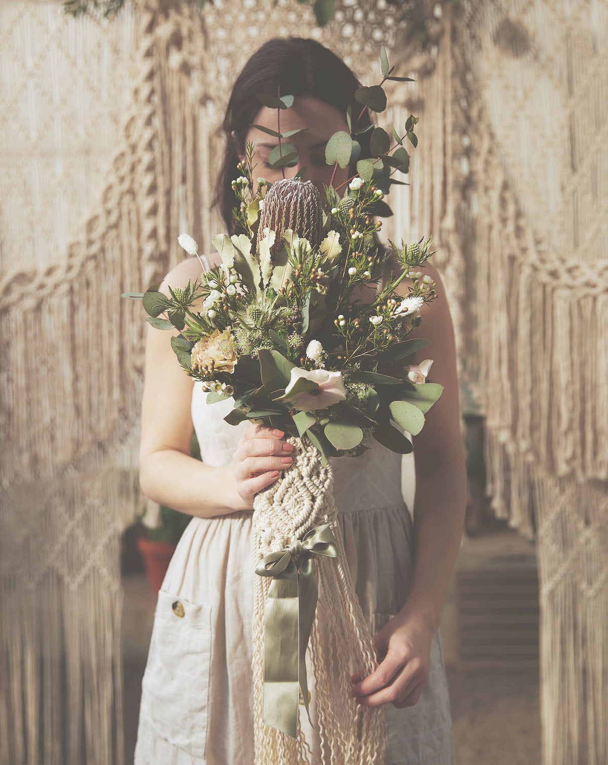 There are two projects in this category: A bouquet wrap and a wedding backdrop. The bouquet wrap is made with 4 mm 3-ply rope approx. 40 meters, plus a 1 meter long satin ribbon. The wedding backdrop is made with a mix of 8 and 5 mm single twisted string, approx. 600 meters of the 5 mm and 300 meters of the 8 mm, plus 4 meters of satin ribbon.